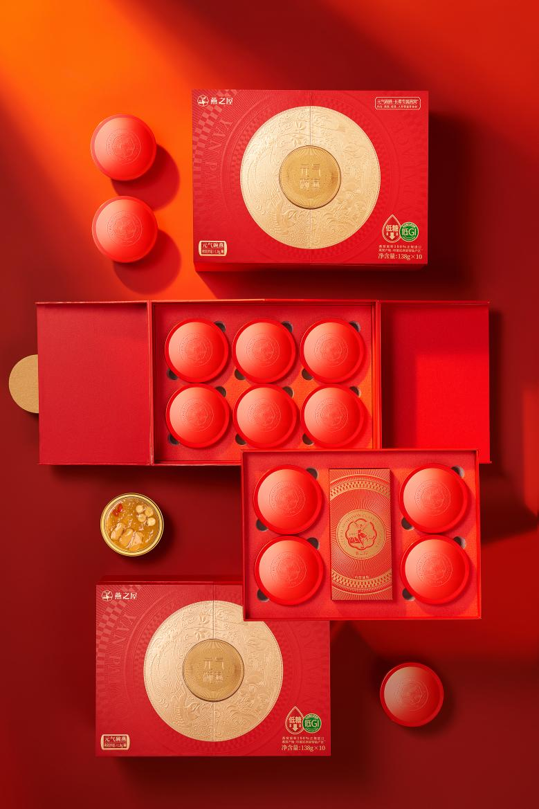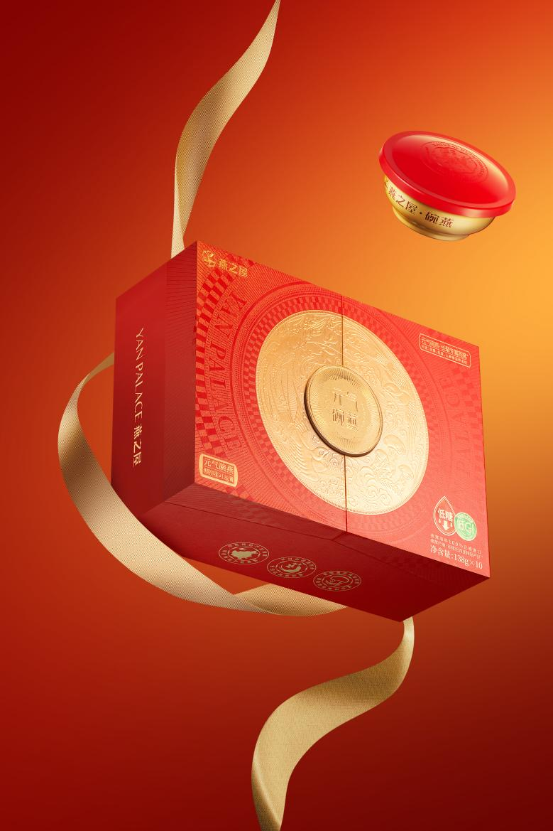 碗燕·元?dú)饪畈捎弥袊?guó)紅與黃金色系的精美配搭,凸顯光亮色澤與尊貴質(zhì)感,大方得體,有禮有面,作為母親節(jié)禮物盡顯尊貴格調(diào)。禮盒設(shè)計(jì)圍繞“圓”的概念,以年輪為設(shè)計(jì)意象,象征歲月賦予的智慧,也傳遞著圓滿之意。盒上刻畫(huà)金燕反哺動(dòng)人圖景,祥云繁花環(huán)繞其中,蘊(yùn)藏濃厚情意。獨(dú)特的對(duì)稱開(kāi)盒頗具巧思與創(chuàng)意,內(nèi)里雙層設(shè)計(jì),共承十碗珍饈碗燕·元?dú)饪?,滿載濃濃營(yíng)養(yǎng)與深切關(guān)懷,讓滋補(bǔ)觸手可及,關(guān)愛(ài)無(wú)處不在。